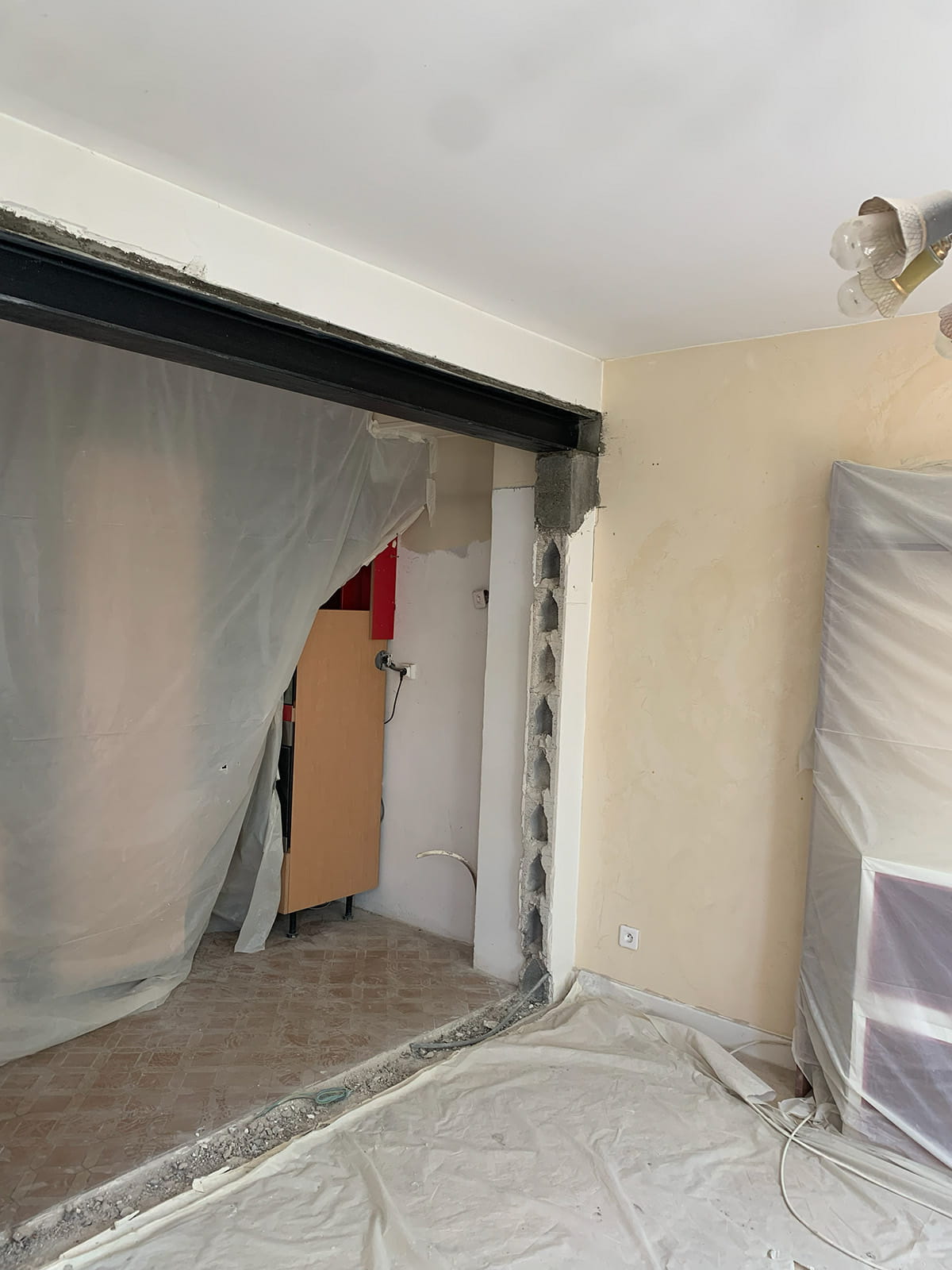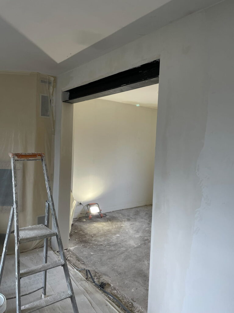 Ouverture d’un mur porteur avec pose d’IPN, permettant de repenser les volumes et d’apporter plus de luminosité.